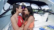 Brunettes with gorgeous shapes staged a fight over the captain of the yacht and, to calm them down, the man decided to take advantage of both depraved beauties. The chicks agreed to passionate kisses, which soon turned into lesbian sex with cunnilingus. Then the brunettes asked for a LJ and eventually took turns cumming from deep penetration into pussies.