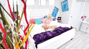 A sexy blonde with big breasts settled comfortably on the bed and, while her stepfather was not looking, began to masturbate her pink pussy. The girl in stockings fully enjoyed her fingers, and when she attracted the attention of an adult man, she let him lick her cap and, sucking a dick in return, got it deep into her vagina and finished.